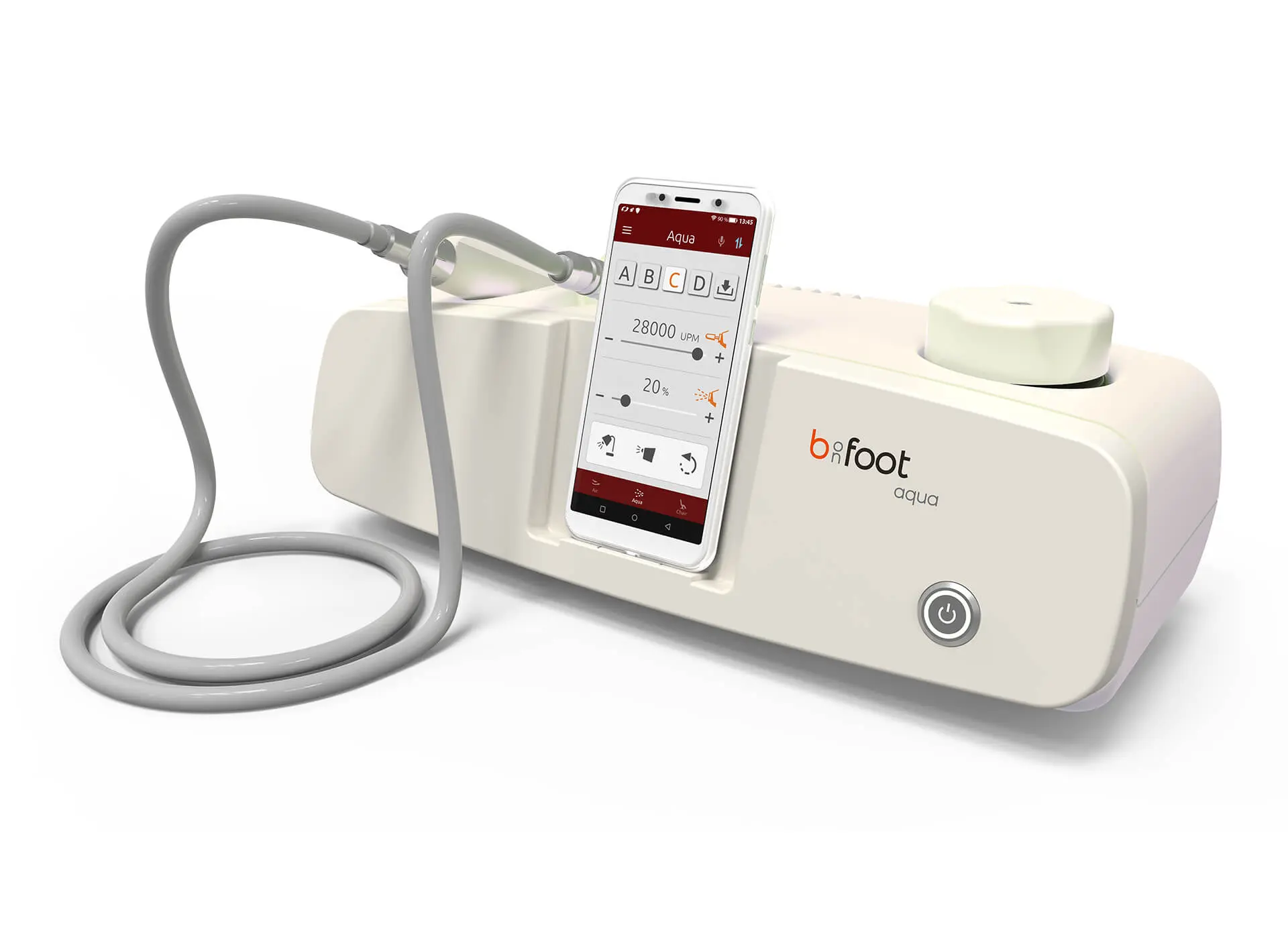 Das Fußpflegegerät b-on-foot aqua bringt Wellness in die Maniküre und Pediküre, sorgt für gute Laune in Studio oder Praxis und überzeugt mit nachhaltiger Technik, die sich 1000fach beim Marktführer bewährt hat. b-on-foot aqua verbindet hohe Fräsleistung mit kühlender Spraytechnik.