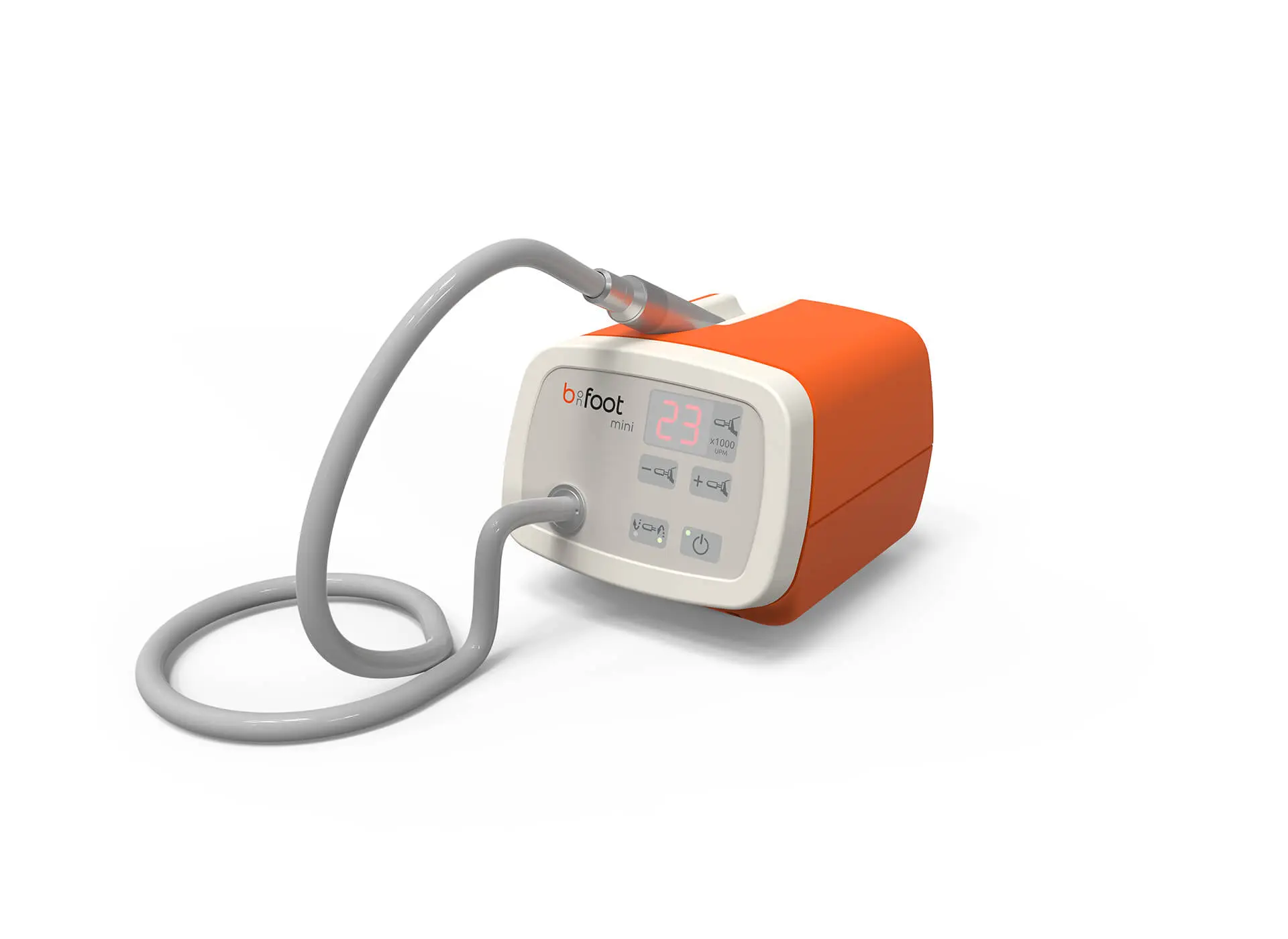 In einem ergonomisch gestalteten Handstück sorgt der b-on-foot Mikromotor wartungsfrei und verschleißarm für Drehzahlen bis von 2.500 bis 42.000 U/min. Der bürstenlos kommutierte Antrieb verbindet hohe Leistung mit geringer Wärmeentwicklung und einem Gewicht von nur 170 Gramm. So können Sie ohne Ermüdungserscheinungen länger behandeln.