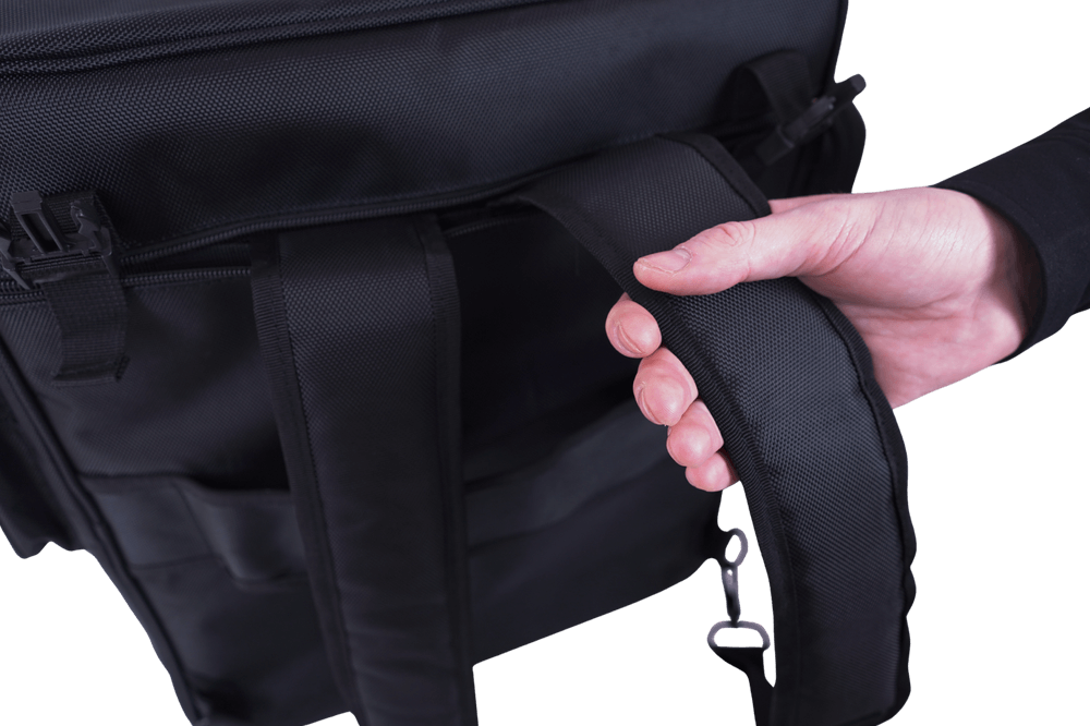 Die b-on-foot Tasche mit Rucksackfunktion ist eine robuste und flexible Transportlösung für den professionellen Einsatz. Die integrierte Rucksackfunktion befindet sich auf der Rückseite im Inneren der Tasche. Die Gurte werden bei Bedarf entnommen und mit Karabinern befestigt, sodass die Tasche bequem auf dem Rücken getragen werden kann.